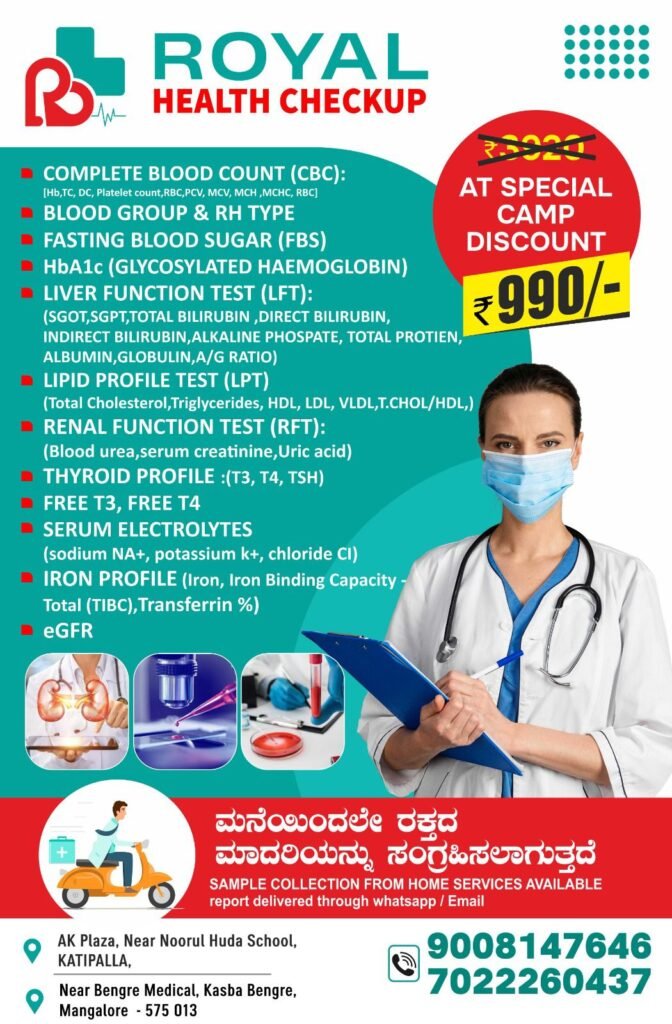 ಮಂಗಳೂರು :77 ನೇ ಸ್ವಾತಂತ್ರ್ಯೋತ್ಸವದ ಅಂಗವಾಗಿ ರಾಯಲ್ ಹೆಲ್ತ್ ಚೆಕ್ಅಪ್ ಇದರ ವತಿಯಿಂದ ಉಚಿತ ರಕ್ತ ತಪಾಸಣೆ ಶಿಬಿರವು ಆಗಸ್ಟ್ 15 ರಿಂದ 17ರ ವರಗೆ ನಗರದ ಕಾಟಿಪಳ್ಳ ಎ.ಕೆ ಪ್ಲಾಜಾ, ನೂರುಲ್ ಹುದಾ ಶಾಲೆ ಬಳಿ ನಡೆಯಲಿದೆ.