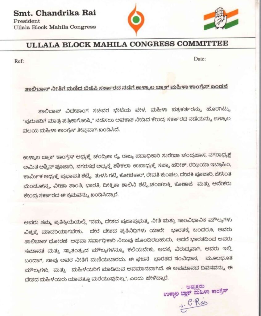 ಉಳ್ಳಾಲ : ತಾಲಿಬಾನ್ ವಿದೇಶಾಂಗ ಸಚಿವರ ಭೇಟಿಯ ವೇಳೆ, ಮಹಿಳಾ ಪತ್ರಕರ್ತರನ್ನು ಹೊರಗಿಟ್ಟು “ಪುರುಷರಿಗೆ ಮಾತ್ರ ಪತ್ರಿಕಾಗೋಷ್ಠಿ ನಡೆಸಲು ಅವಕಾಶ ನೀಡಿದ ಕೇಂದ್ರ ಸರ್ಕಾರದ ನಡೆಯನ್ನು ಉಳ್ಳಾಲ ವಲಯ ಮಹಿಳಾ ಕಾಂಗ್ರೆಸ್ ತೀವವಾಗಿ ಖಂಡಿಸಿದೆ.