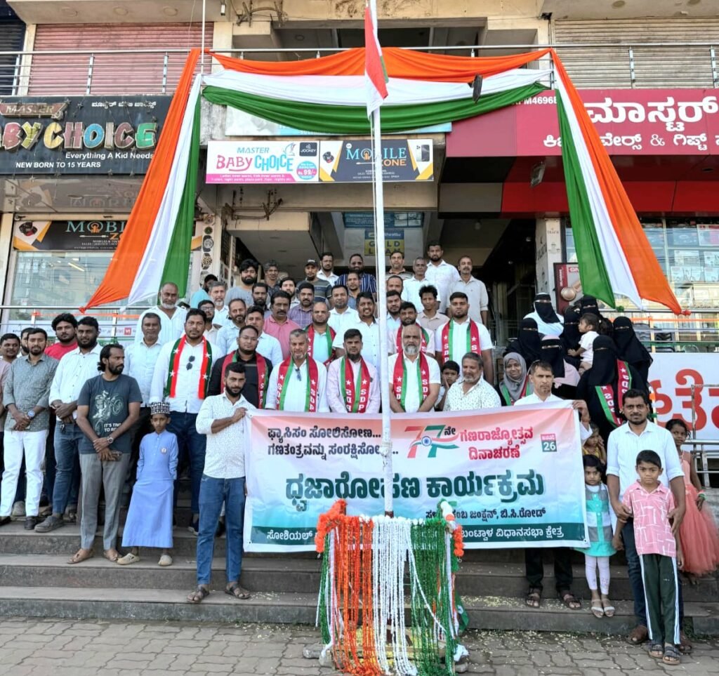 ಬಂಟ್ವಾಳ: ಸೋಶಿಯಲ್ ಡೆಮಾಕ್ರಟಿಕ್ ಪಾರ್ಟಿ ಆಫ್ ಇಂಡಿಯಾ (SDPI), ಬಂಟ್ವಾಳ ವಿಧಾನಸಭಾ ಕ್ಷೇತ್ರ ಸಮಿತಿಯ ವತಿಯಿಂದ 77ನೇ ಗಣರಾಜ್ಯೋತ್ಸವದ ಪ್ರಯುಕ್ತ “ಸಂವಿಧಾನ ಮೌಲ್ಯಗಳ ರಕ್ಷಣೆ – ಗಣರಾಜ್ಯ ಸಂಭ್ರಮ” ಎಂಬ ಘೋಷವಾಕ್ಯದೊಂದಿಗೆ ದ್ವಜಾರೋಹಣ ಕಾರ್ಯಕ್ರಮವನ್ನು ಕೈಕಂಬ ಪಕ್ಷದ ಕಚೇರಿ ಮುಂಭಾಗದಲ್ಲಿ ಆಯೋಜಿಸಲಾಯಿತು.
